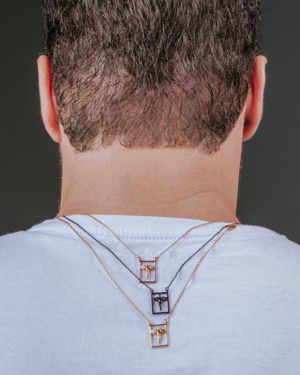 Chamado de Escapulário em português, é historicamente um colar religioso com 2 pingentes. Originário do manto usado por monges, caindo de ombro a ombro, ele incorpora Dignidade e Poder Sacerdotal. DUEROS pegou este belo e histórico símbolo que remonta ao século VII e deu ao colar um design moderno, mas mantendo sua herança tradicional. Especialmente conhecido e popular no Brasil nos tempos atuais, o Escapulário é para ser presente para pessoas com um vínculo especial entre si, um talismã que protege a pessoa amada para quem você o compra.